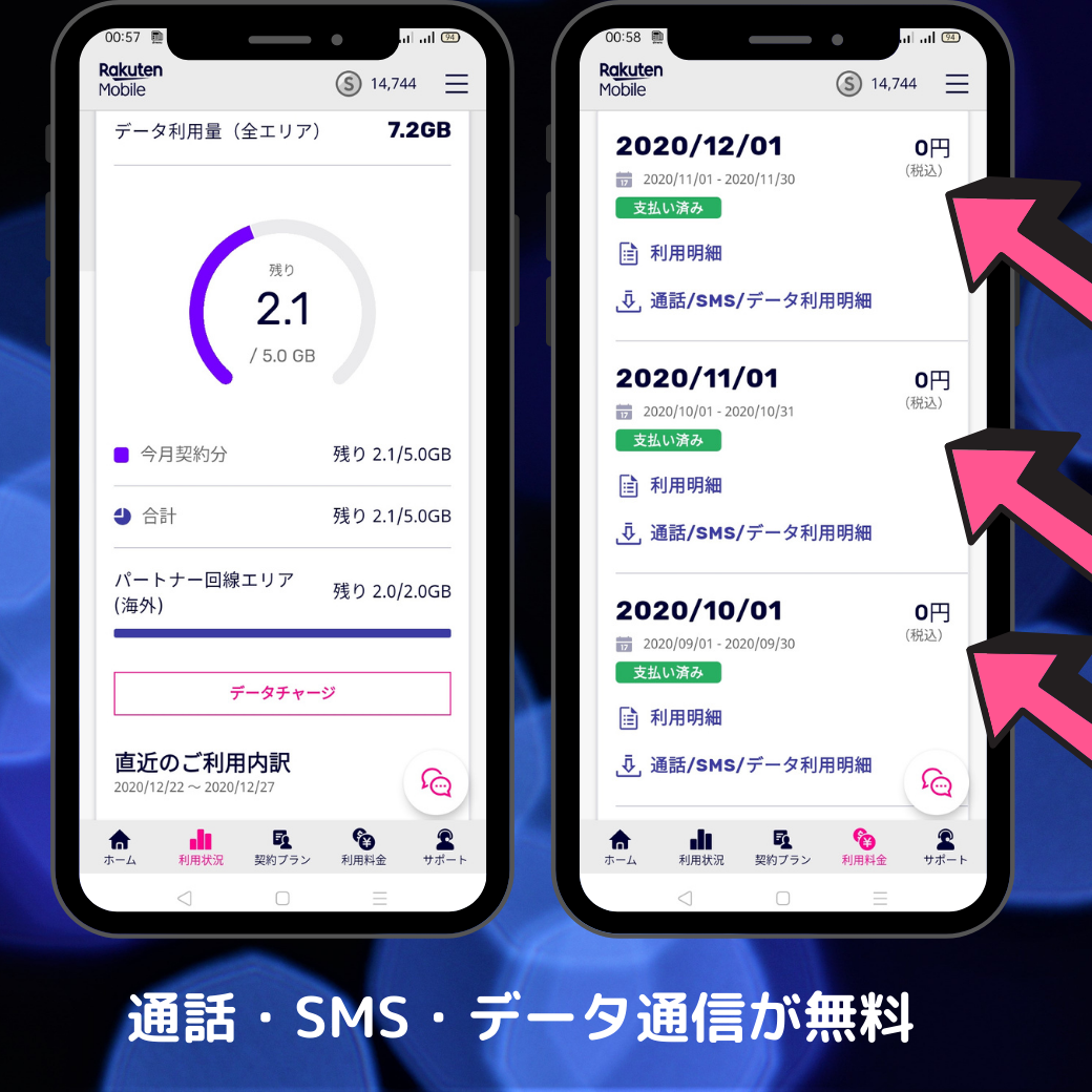 楽天モバイルは、端末代金、利用料金ともに0円です。